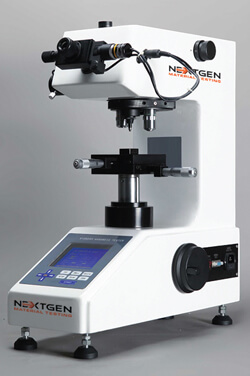 NextGen Material Testing, Inc. offers a highly precise and cost effective option for all Vickers and Knoop testing requirements. The NG1000 hardness tester is available in different configurations (AGEN, DGEN and CCD) in order to meet all requirements for sample volumes and required accuracy. The NG1000 features an easy to see LCD display in all lighting environments, motorized turret, built in mini printer and a user friendly menu for operation. Optional items include a 15x Eyepiece, digital micrometers, automatic VickSoft software and dual Vickers and Knoop indenters.